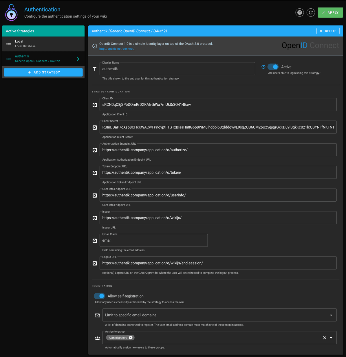 - Issuer: https://authentik.company/application/o/wikijs/